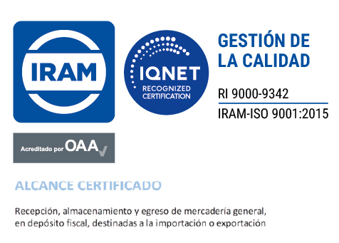 Nuestro Sistema de Gestión de la Calidad cumple con los requisitos de la norma IRAM – ISO 9001:2015 para la recepción, almacenamiento y egreso de mercadería general en Depósito Fiscal, destinadas a la importación o exportación.